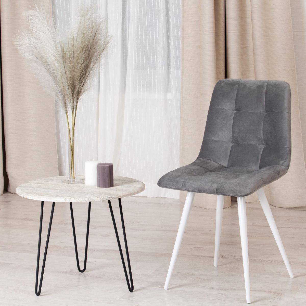 ткань/металл, 45x53х88 см, высота до сиденья 50 см, серый barkhat 26/белый Удобный и практичный дизайн стула CHILLY из коллекции Modern позволит ему вписаться практически в любой интерьер. Стул можно расположить в гостиной, кухне или столовой. Он хорошо подойдет для обстановки городской квартиры, загородного дома, кафе или ресторана. Тонкие металлические ножки белого цвета, стеганая тканевая обивка и лаконичные формы стула идеально соответствуют концепции современного стильного пространства. Мягкое сиденье и спинка позволяют комфортно расположиться на длительное время. Практичная тканевая обивка серого цвета отличается устойчивостью к износу и долговечностью, благодаря чему стул не требует специального ухода и будет долгое время радовать вас своим первоначальным видом. Монолитный каркас изделия выполнен из многослойного гнутоклееного шпона толщиной 10 мм. Наполнение - комбинация пенополиуретанов различной плотности. Стул подойдёт для гостиной, для кухни, для спальни, для ресторана или