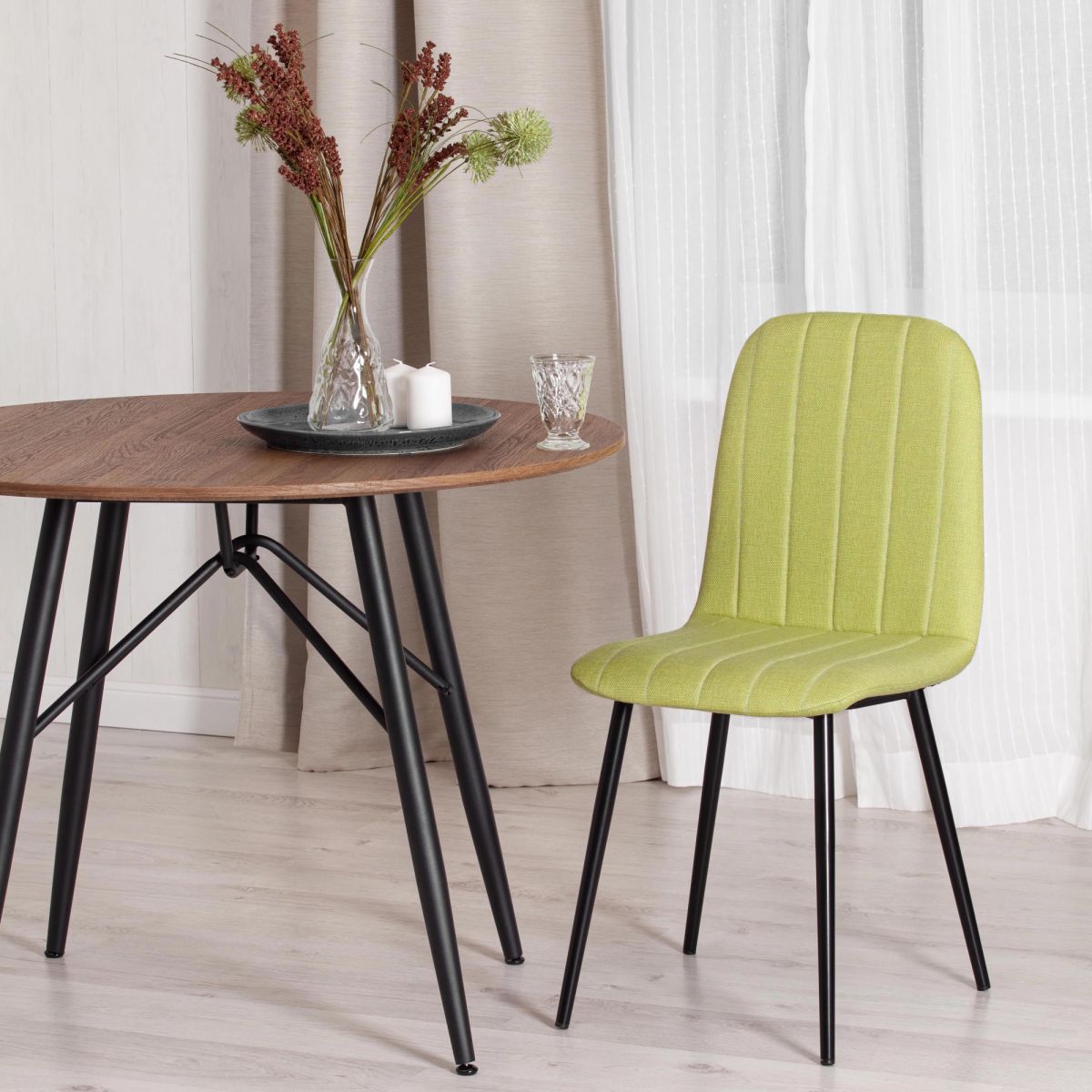 ткань/металл, 46 х 52 х 88 см, фисташковый 64/черный Легкий и элегантный дизайн стула ARC из коллекции Modern украсит собой любую домашнюю обстановку. Этот удобный и легкий стул будет отличным украшением для гостиной, кухни, спальни, ресторана или кафе. Мягкое сиденье и спинка позволяют комфортно сидеть в течение длительного времени. Тканевая обивка фисташкового цвета будет органично смотреться в любом интерьере. Четыре прочные металлические ножки делают модель устойчивой и надежной. Стул будет радовать вас своим первоначальным видом долгие годы. Стул очень прост в сборке, инструкция по сборке прилагается.