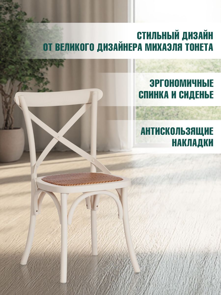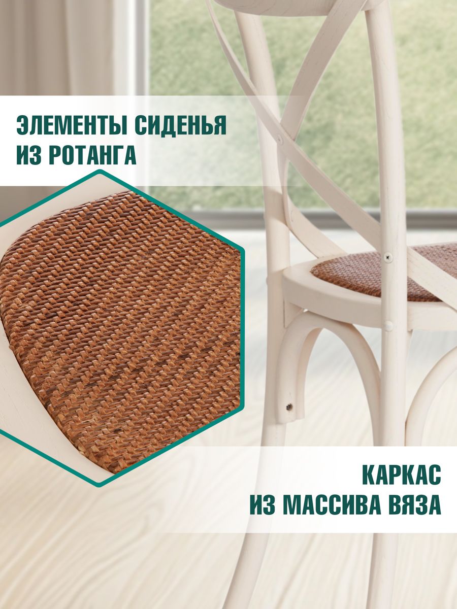 дерево вяз, 49.5*53.5*87, Белый (butter white) Легкий и элегантный дизайн, простые линии и естественные цвета классического венского стула Secret De Maison CROSS, выполненного в стиле гениального творения Михаэля Тонета, украсят собой любую домашнюю обстановку. Сочетание плетеного сиденья из натурального ротанга и каркаса из массива вяза, покрашенного в белый цвет, придает стулу особенную красоту и оригинальность. Эргономичная спинка и удобное сиденье позволят комфортно сидеть в течение длительного времени. Конструкция изделия разработана с учетом равномерного распределения нагрузки. Натуральный ротанг и массив вяза – прочные и долговечные материалы, не требующие специального ухода, способные выдерживать большую нагрузку. Стул будет радовать вас своим первоначальным видом долгие годы. Модель идеально сочетается с мебелью из коллекции THONET, поставляется в собранном виде.
