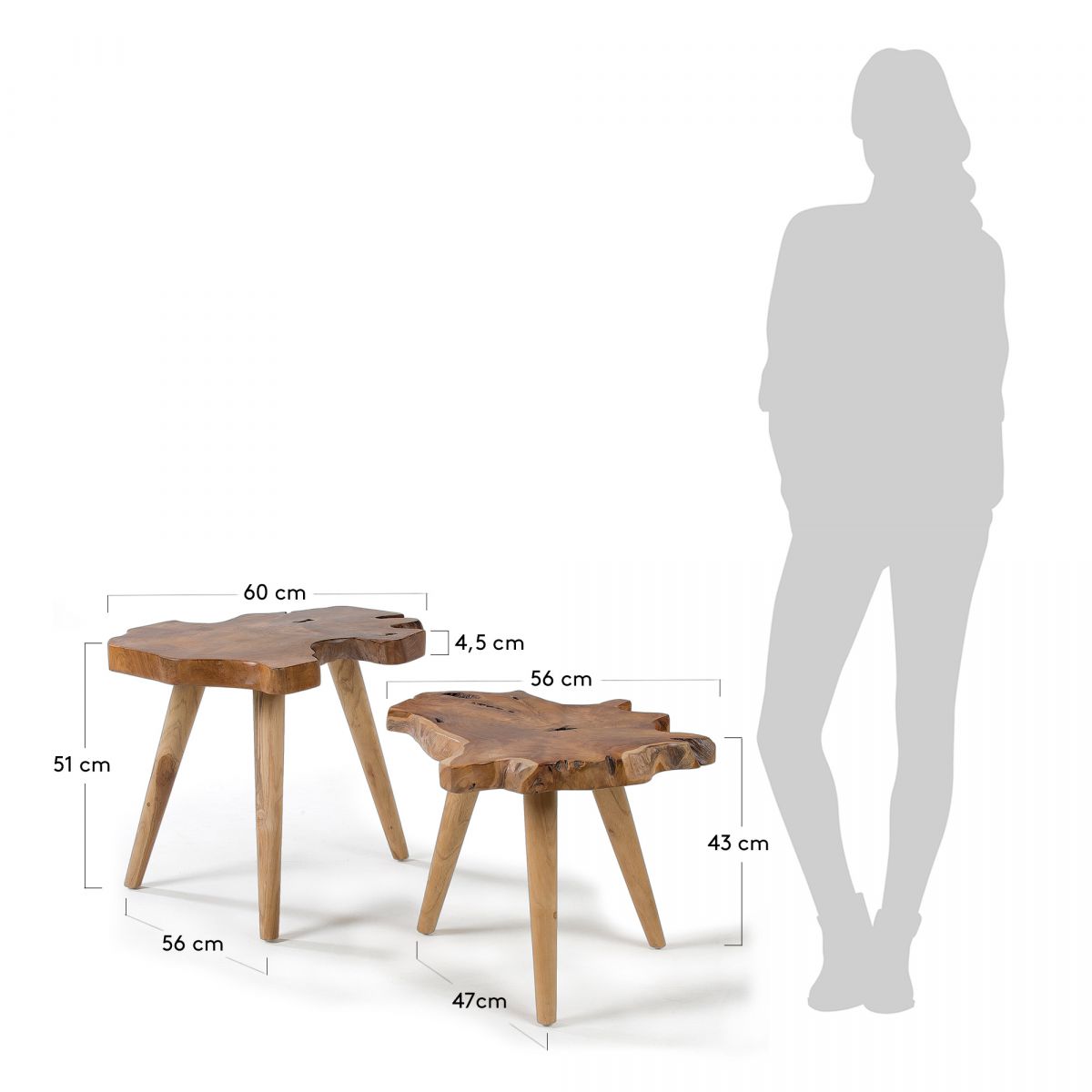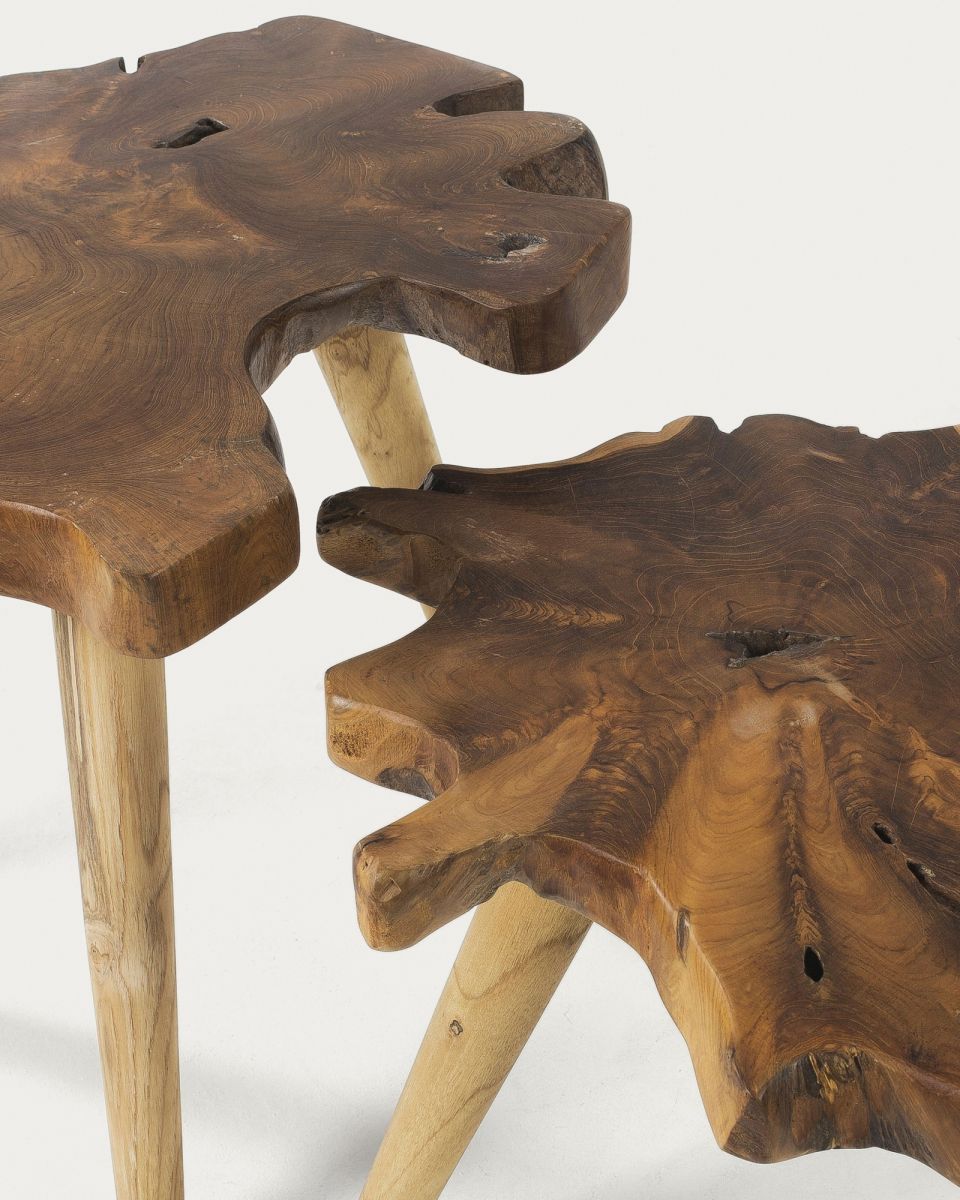Комплект столиков Harris от фабрики La Forma – природная композиция из тиковой древесины.Комплект столиков Harris – это подарок самой природы, который руки испанских мастеров лишь слегка упаковали. Естественный цвет с уникальными перекатами зерен и вершин и хаотичная форма столешниц делают столики абсолютно эксклюзивными изделиями. К тому же, они обладают удивительной прочностью, что существенно расширяет их функционал. Столики полностью сделаны из тикового дерева. Столешница представляет собой цельный спил толщиной 4,5 см. Он опирается на три конусные ножки, которые равноудалены друг от друга на расстоянии 47 см и 56 см. На каждой есть нейлонова накладка для защиты дерева и напольного покрытия от деформации.Поверхность столиков полностью покрыта лаком, который защищает от негативного воздействия влаги, загрязнений.Максимально допустимая нагрузка на столики – 80 кг.Размеры: ширина – 60 и 56 см, высота – 51 и 43 см.Суммарный вес – 15 кг.Сборка займет 15 минут. Инструкция и крепеж в комп