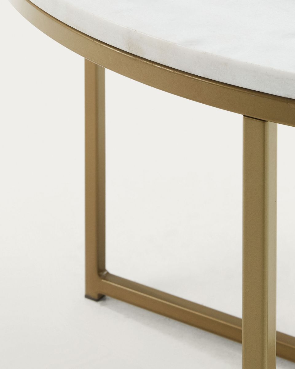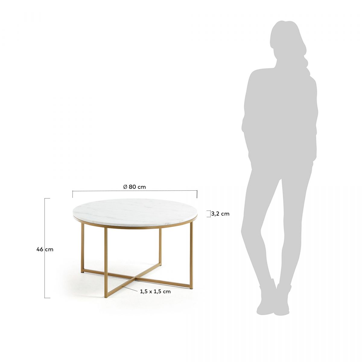 Журнальный столик Sheffield 80 см от фабрики La Forma – потрясающий мрамор и облегченная конструкция.Журнальный столик Sheffield моментально убеждает в своем превосходстве. Мраморная столешница – это не просто ценность модели, это еще и украшение для всего интерьера. Такой стол по праву сможет занять центральное место, стать самым роскошным предметом мебели в гостиной.Стол круглой формы. Столешница выполнена из натурального мрамора. Этот природный камень прочный и долговечный, обладает изумительным и уникальным природным орнаментом. Высота столешницы – 3,2 см.Опора состоит из двух рамочных стоек, которые приварены к обручу, удерживающему столешницу. Материал ее изготовления – сталь с латунным покрытием. На каждой ножке предусмотрены специальные накладки, которые защищают напольное покрытие от повреждений.Прочность металла обеспечивает стойкость изделия к нагрузкам (максимально 25 кг). Размеры: диаметр – 80 см, высота – 46 см.Вес – 25,5 кг.Потребуется самостоятельная сборка. Крепеж вход