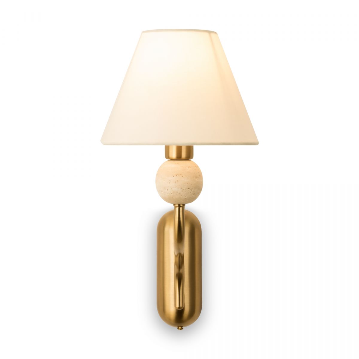 Арматура - металл в цвете латунь. Тканевые абажуры, травертиновые элементы. Лампы E14 (в комплекте). Серия состоит из люстры c 5 плафонами и бра. Трендовое сочетание в классическом стиле.