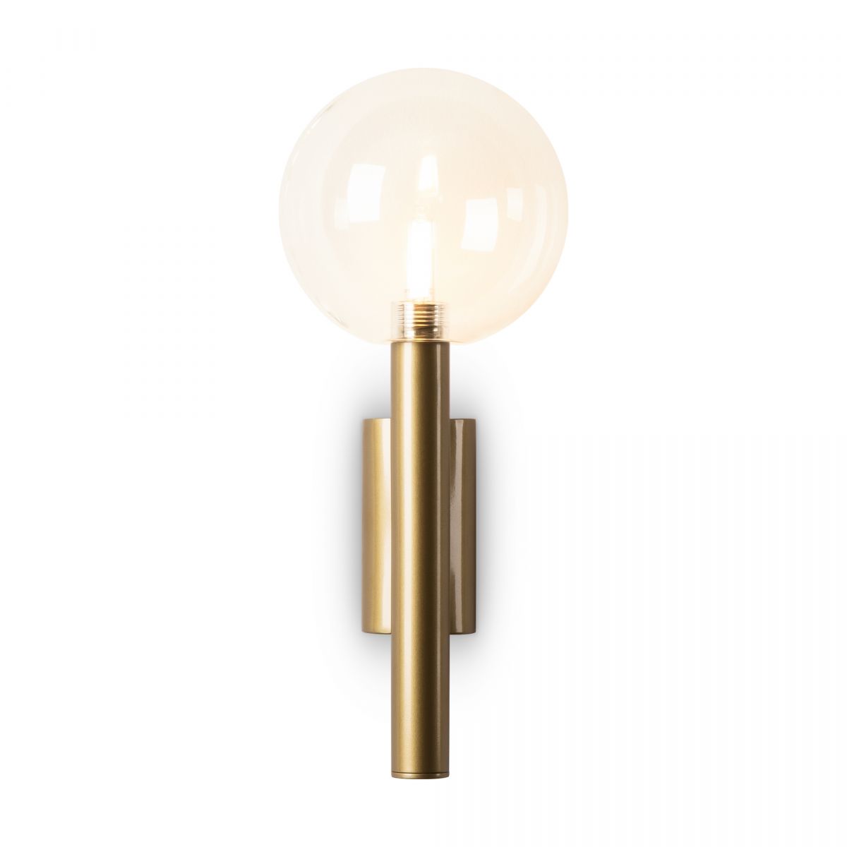 Арматура - металл в цвете матовое золото. Светильники с прозрачным дутым стеклом. LED источник света (2700K). Круглые стеклянные абажуры создают тёплый свет. У настенного светильника 2 источника света.