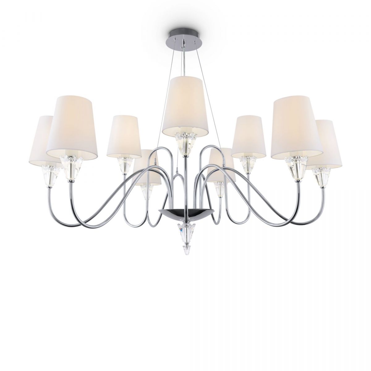 Массивный декор стеклянных граней выделяет светильники этой серии среди других моделей. Хромированную металлическую арматуру мягко оттеняют белые хлопковые абажуры. Рассеивая свет, они дарят уютное, атмосферное освещение. Классическая грациозность светильников выражена в элегантных изгибах рожков и подчеркнутой гармонии оттенков. Серия включает регулируемую по высоте подвесную люстру на 12 и 9 плафонов, две настольные лампы, а также бра на один и три плафона.