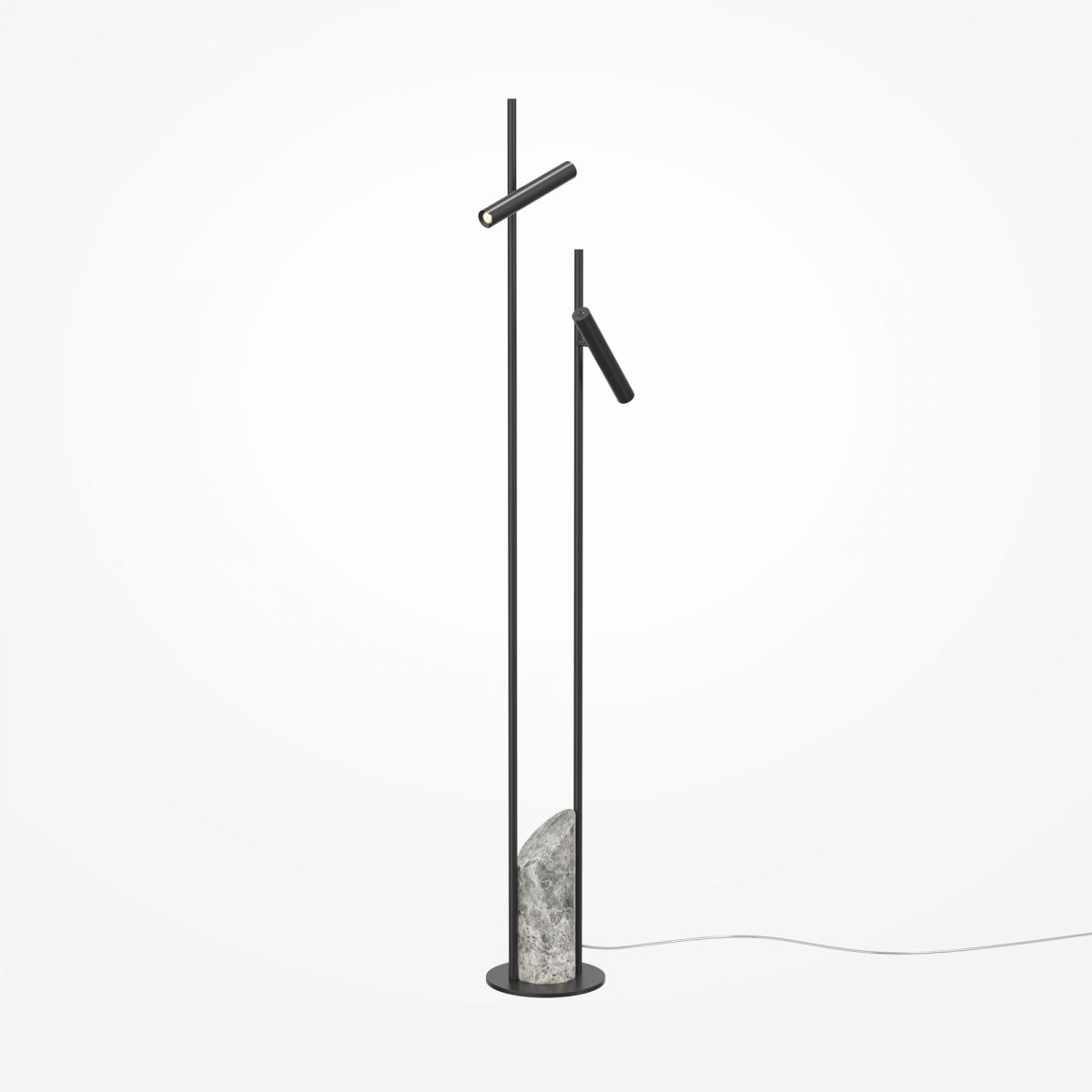 В основе дизайна — эстетика ар деко. Массивное основание из натурального мрамора с уникальным рисунком. Материал арматуры: металл. Серия представлена в двух цветовых решениях: чёрная арматура с антибликовым покрытием и серый мрамор; или арматура в цвете сатинированной латуни с белым мрамором. Два независимых поворотных спота с углом вращения 180° по горизонтали и 90°. Свет LED-источника (3000К) можно легко и точно направить. Продуманная эргономика – кнопки включения установлены на каждом споте.