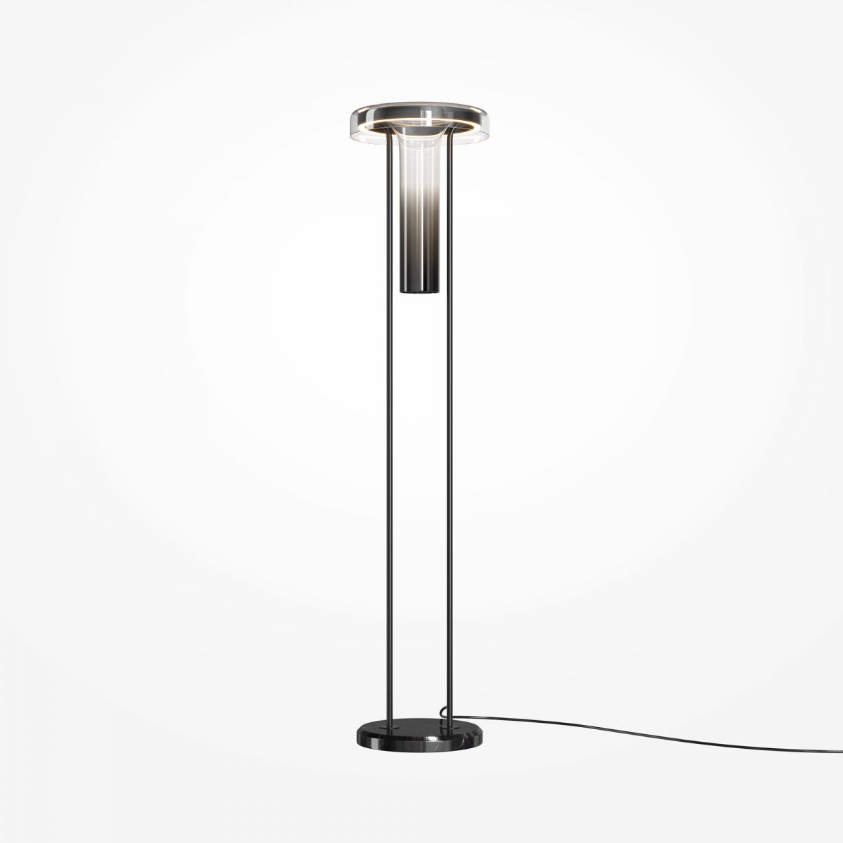 Уникальная в своем роде концепция торшера-вазы. Материал арматуры: металл; материал вазы: стекло. Два контрастных дизайна. Минималистичный дизайн на черном мраморном основании и вазой с дымчатым градиентом. Яркий дизайн в цвете латуни с вазой из прозрачного стекла и серым мраморным основанием. Ваза съемная. Максимальная нагрузка для вазы не более 1,5 кг. Двунаправленный LED-источник света (3000К). Диммер на проводе позволяет регулировать яркость освещения. Идеален для зон отдыха.