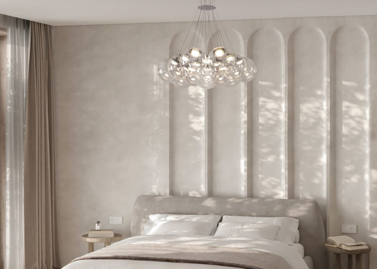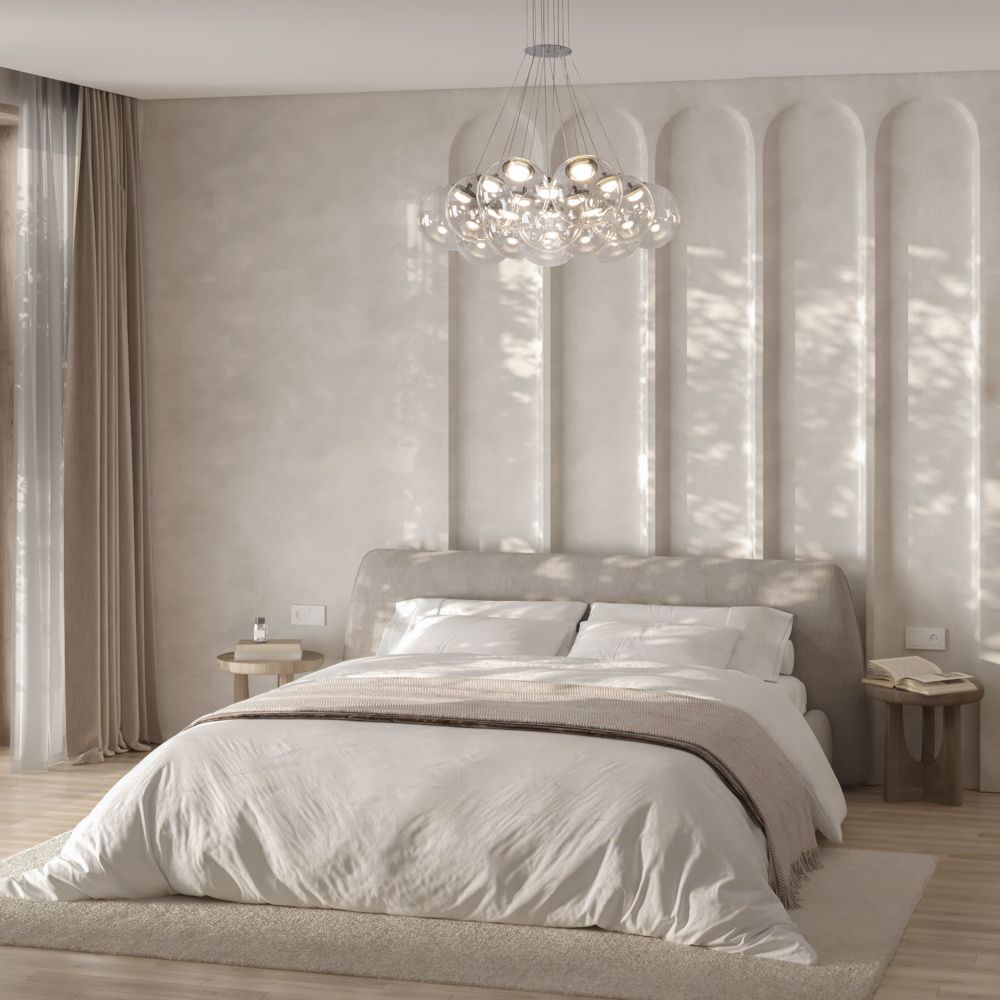Арматура - металл (никель). Абажуры из дутого стекла с LED (2800K). Прозрачные плафоны подчеркивают современный дизайн. Высота 500-2500 мм. Серия станет ярким акцентом в вашем интерьере.