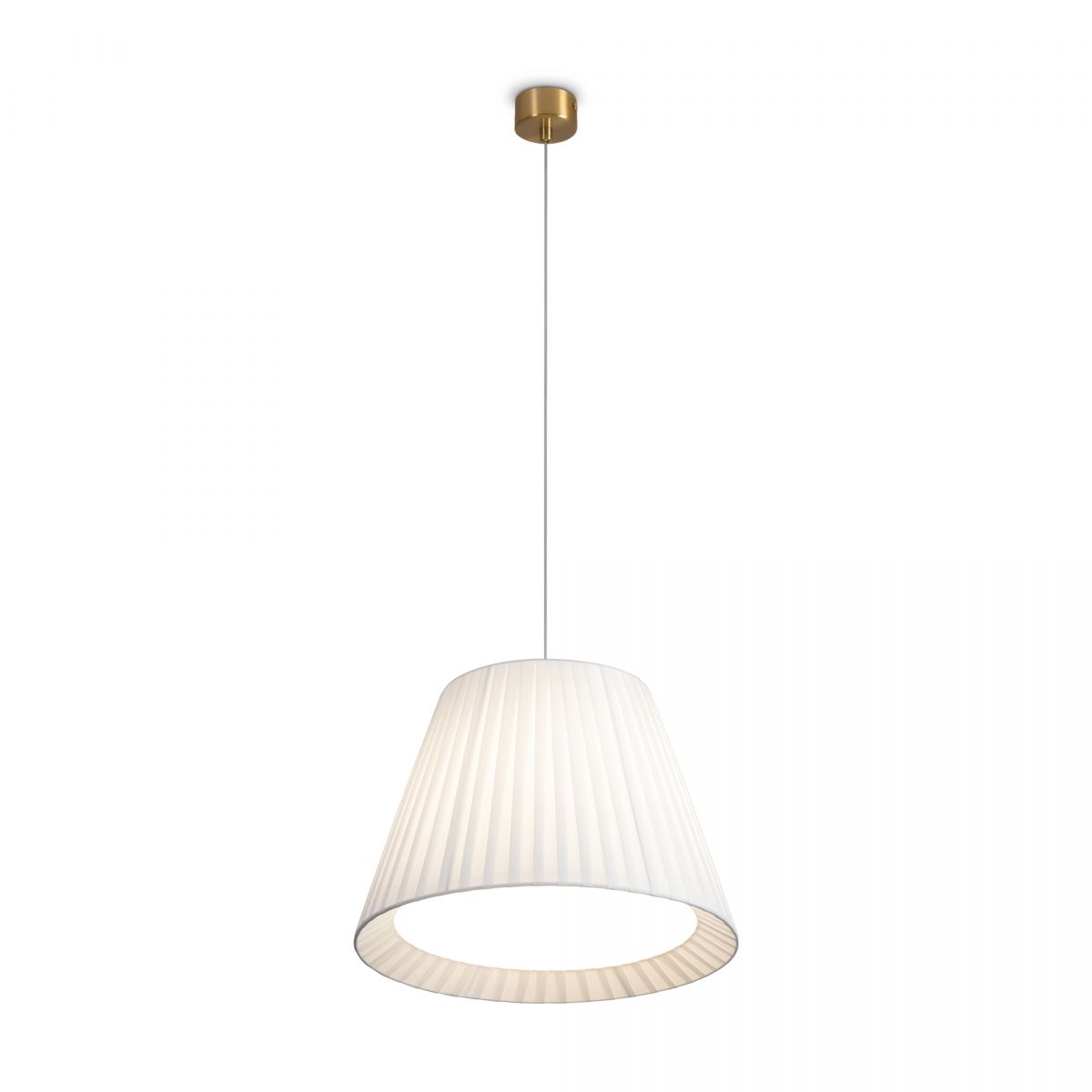 Металлическая арматура в цвете латунь. Подвесные светильники 2-х форм с плессированными абажурами, дополненные рассеивателем. Лампы E27/E14 (не в комплекте) дают мягкий рассеянный свет.