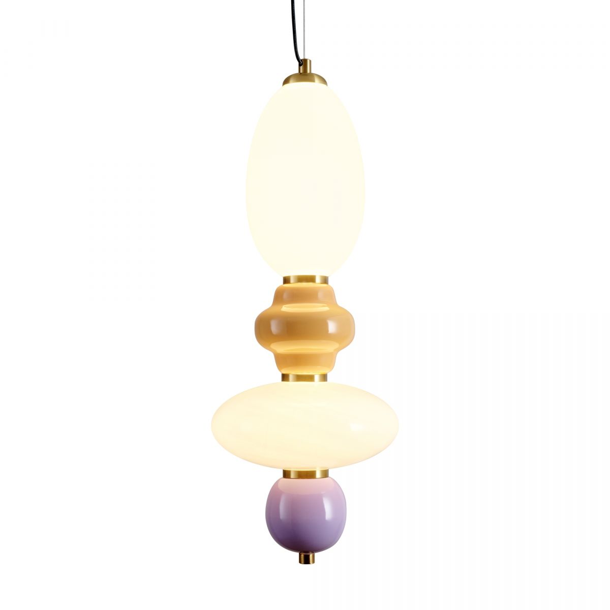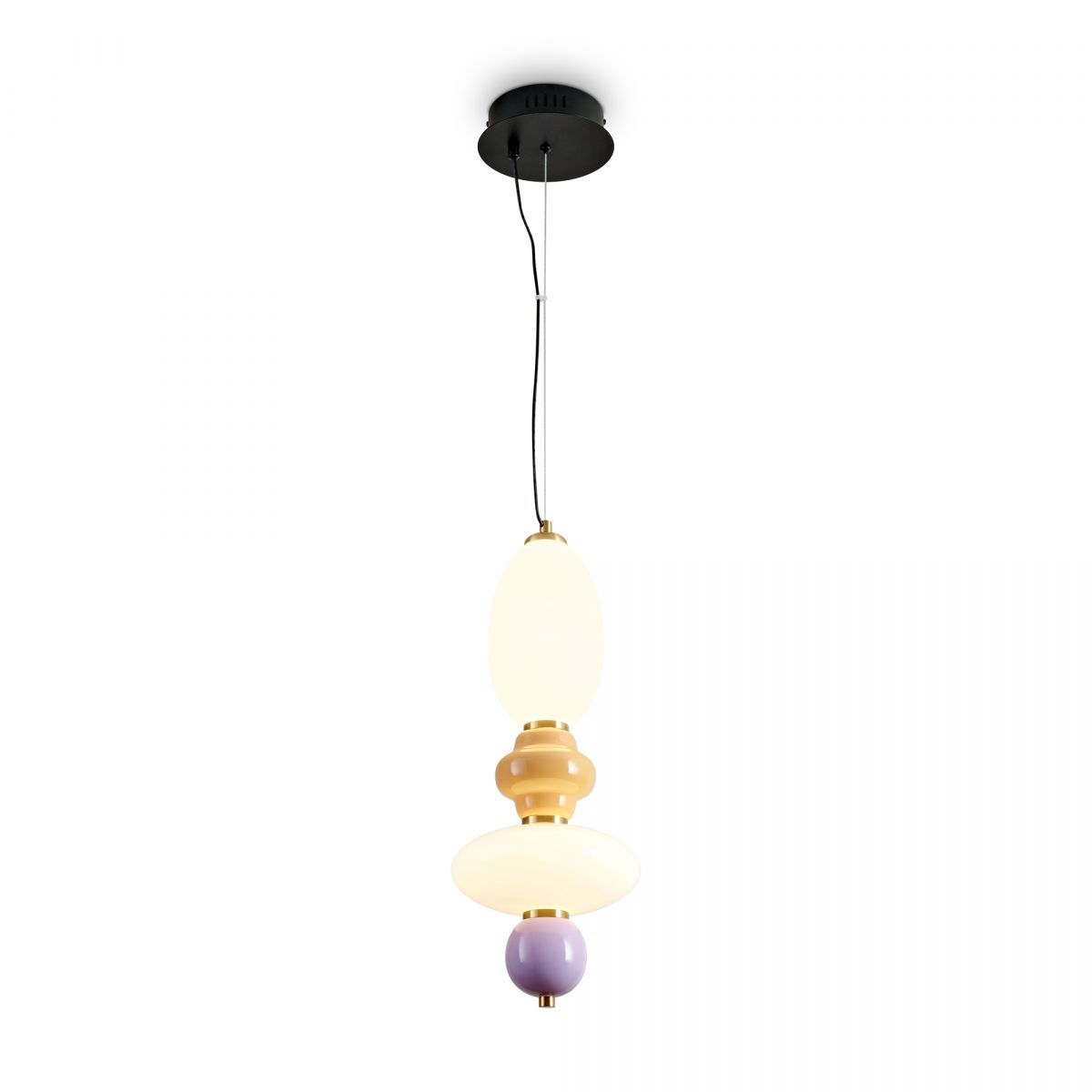 Металлическая арматура черного цвета. Глянцевые белые стеклянные плафоны с перламутровым рисунком и керамическими цветными элементами. LED источник света. Два вида подвеса.