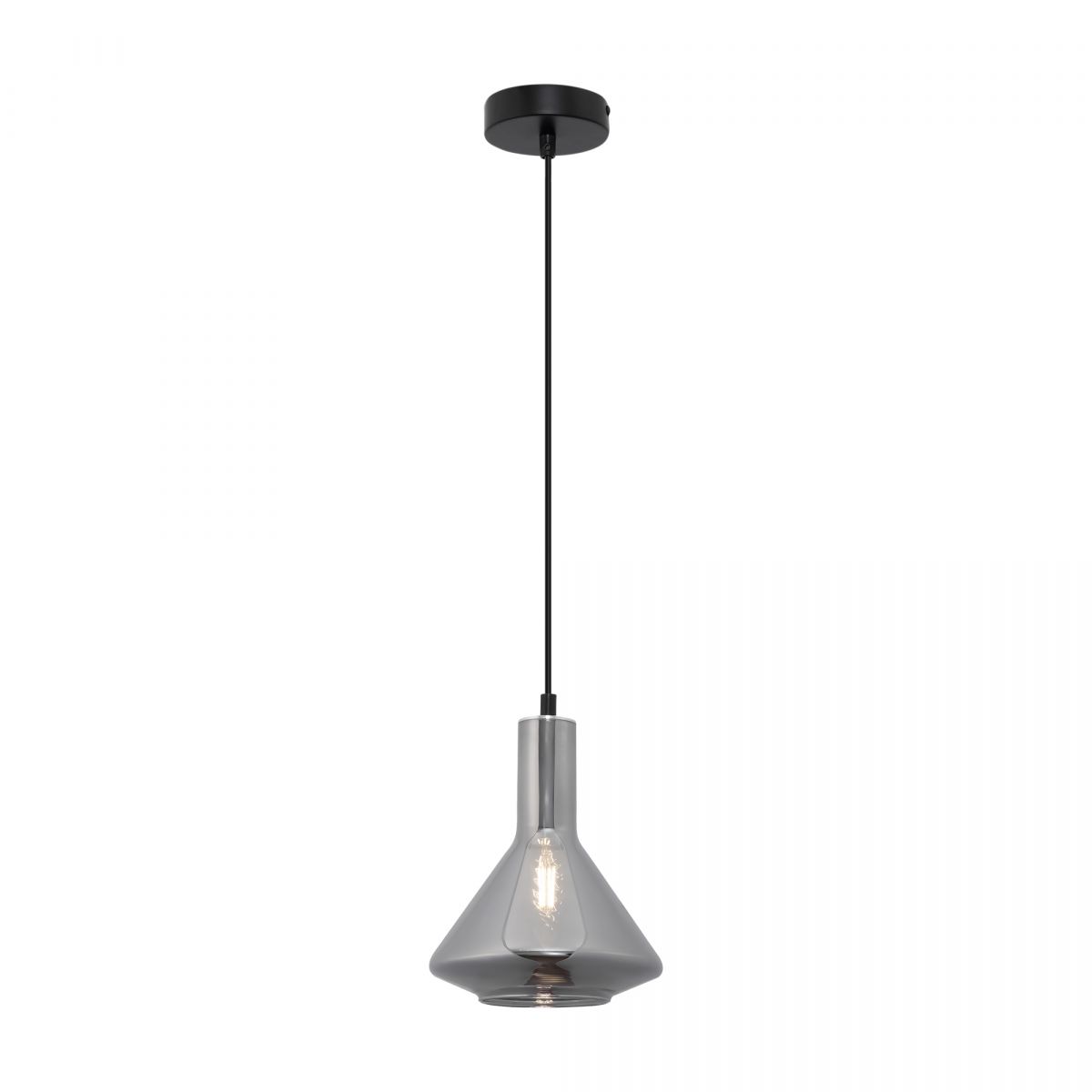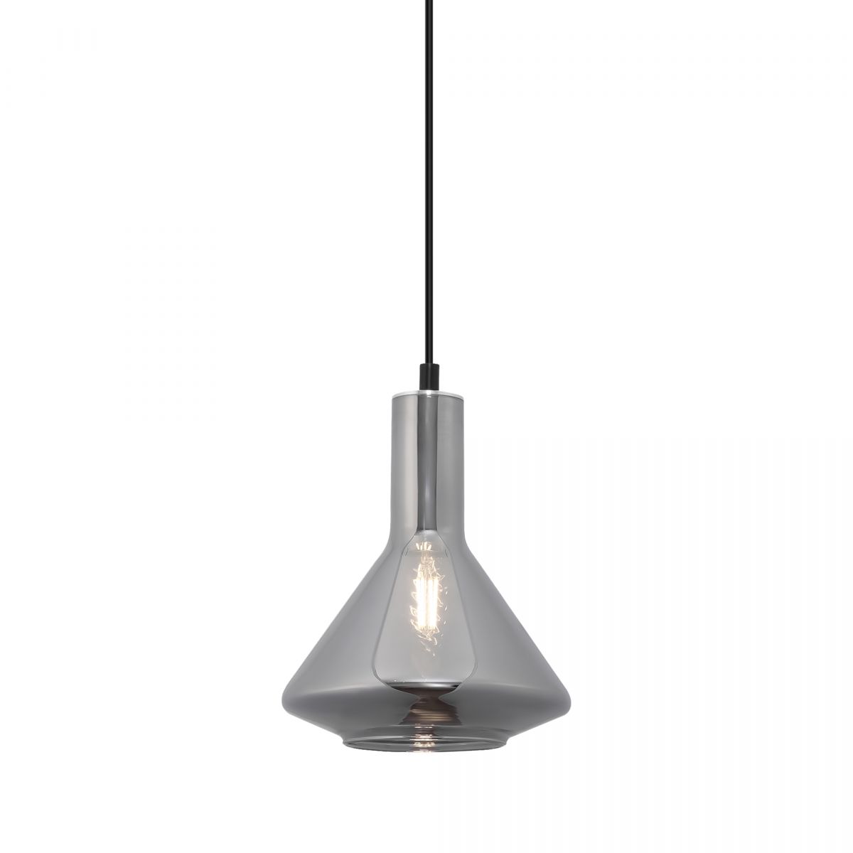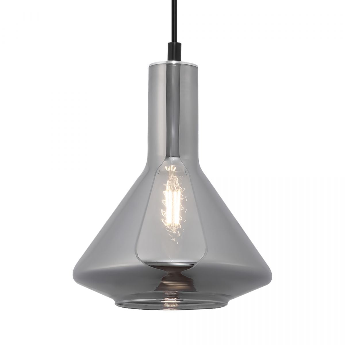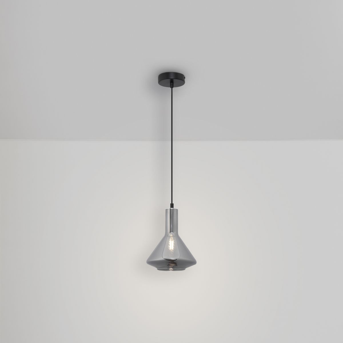 Металлическая арматура черного цвета. Плафон из глянцевого стекла серого оттенка. Нетривиальная форма плафона, расширенная к низу. Источник света – лампа с цоколем E14.