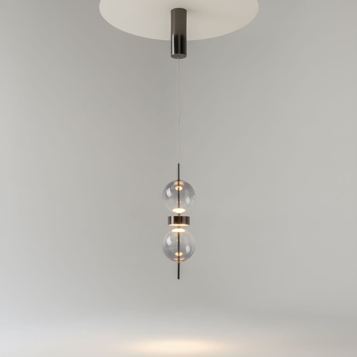 Серия включает подвесной светильник, бра, напольный и портативную модели. Стеклянные плафоны с зеркальным градиентом, черная глянцевая арматура из металла. LED-источник (3000K) скрыт матовым рассеивателем. Конструктивные особенности: магнитные потолочные чаши у подвесов и магнитное основание у бра обеспечивают монтаж без видимого крепежа. Напольный и аккумуляторный светильники диммируются при длительном удержании кнопки. Серия отмечена премиями Red Dot и A’design за инновационный дизайн.