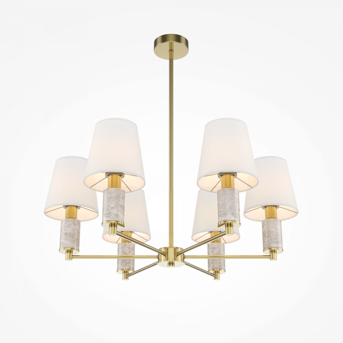 Серия включает подвесные (6 и 8 рожков), настенные, настольные и напольные светильники. Арматура: металл цвета сатинированной латуни с декоративными элементами из серого мрамора. Абажуры: текстиль. Сменный источник света с цоколем E14. Высота подвесных светильников регулируются сегментами штанги. Классический дизайн в современном исполнении. Предназначены для основного и акцентного освещения жилых помещений. Универсальное применение: гостиные, столовые, спальни, кабинеты, прихожие.
