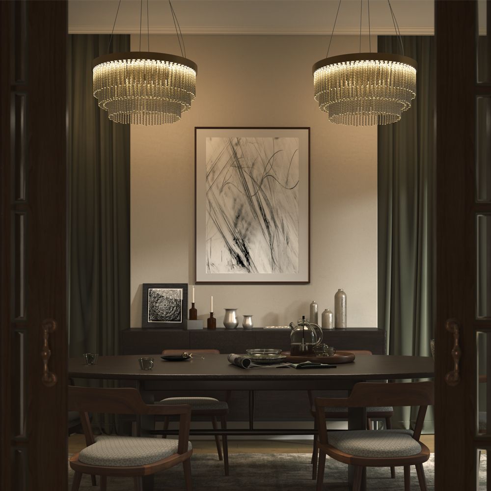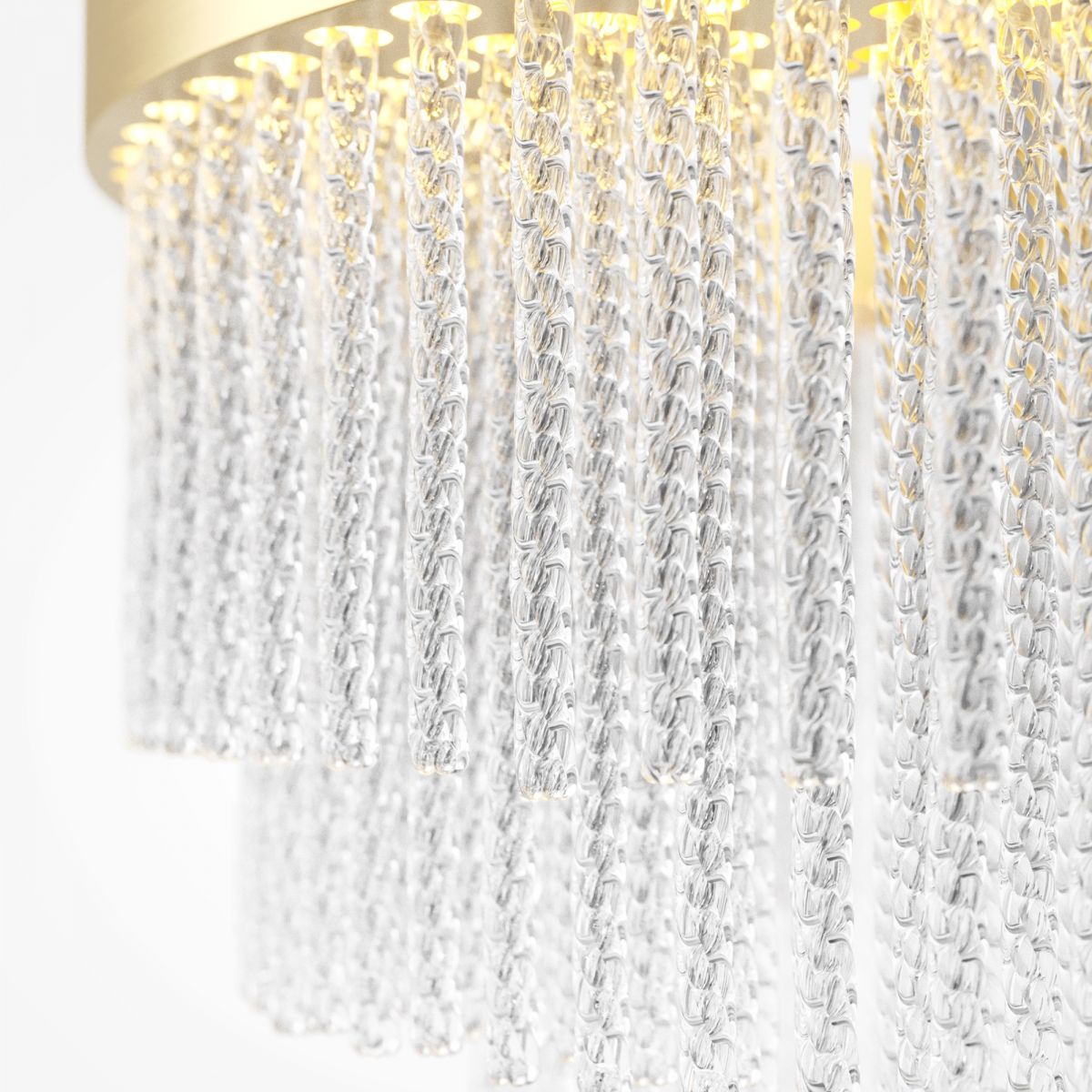 Арматура выполнена из металла в цвете латуни с легким мерцающим финишем. Декоративные элементы: стеклянные трубочки с витиеватым орнаментом, игриво переотражающим свет. Встроенный LED-источник, создающий свет достаточный для основного освещения. Трехступенчатый переключатель позволяет выбирать цветовую температуру: 2700K, 3000K или 4000K. Высота светильника регулируется, максимальная высота - 3300 мм. Высокий индекс цветопередачи CRI >90. Создает изысканное освещение с игрой бликов и переотражен